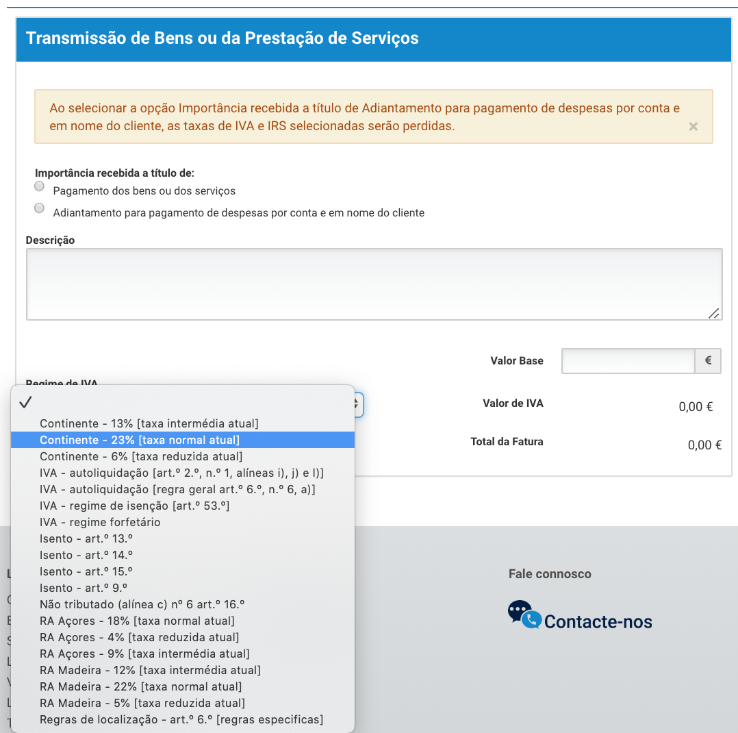 Escolhe a que título estás a faturar o teu serviço ou bem. Nota que tens mais uma opção: "Adiantamento". Serve para quando um cliente te adianta uma verba antes de prestares um serviço ou vender um bem.